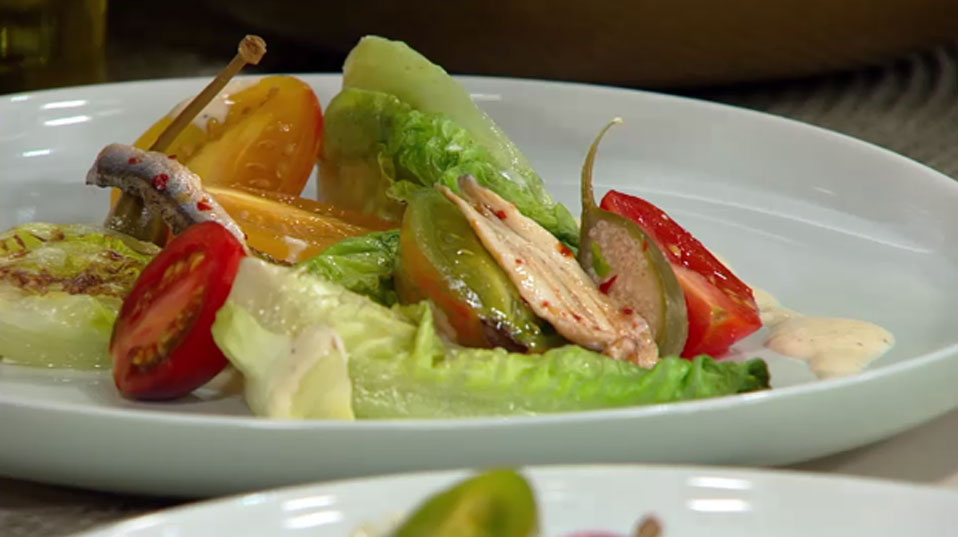 „Caesar-Salat mal anders: Fabian Timmer kombiniert gegrillte Kopfsalatherzen mit Parmesan-Dressing, Kirschtomaten und Kapernäpfeln. Denn es ist Sommer und wir freuen uns über leichte und gesunde Gerichte mit einem Gemüse, das wir im Sommer sehr gerne essen und bei uns in NRW besonders am Niederrhein und im Rheinland angebaut wird.“