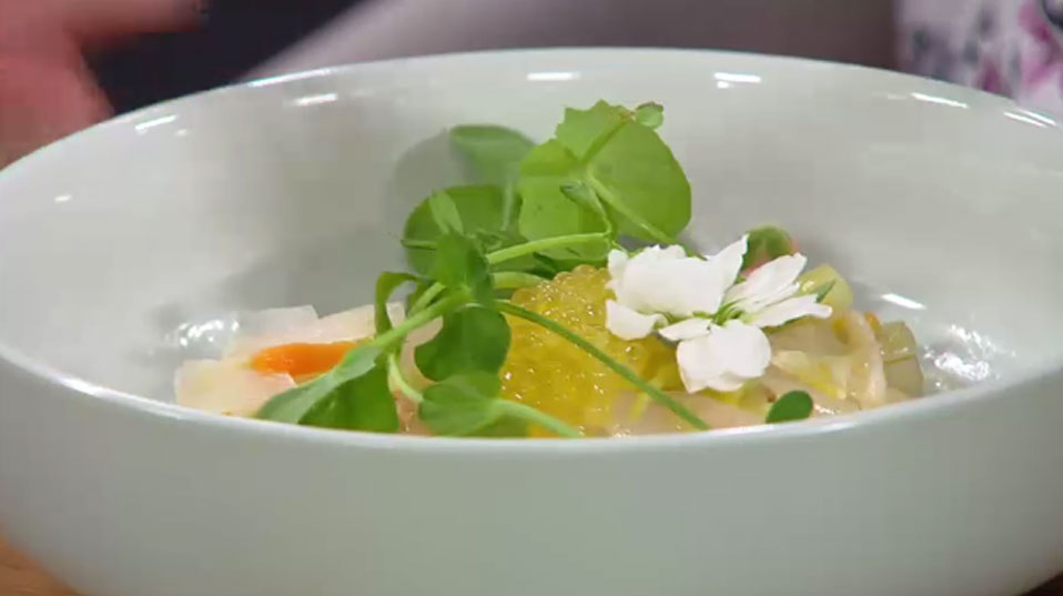 „Fabian Timmer macht ein raffiniertes Fischgericht: Forelle im Wurzelsud mit zarten Drillingen, aromatischem Dillöl und frischem Wildkräutersalat. Der Koch zeigt, wie Sie mit einfachen Zutaten ein elegantes und köstliches Essen auf den Tisch bringen.“